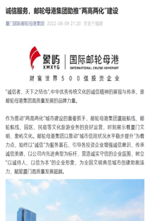 尊龙集团旗下邮轮母港集团立足邮轮母港集团文化、为广大市民、游客提供旅游服务的窗口特性,积极开展“集案例、树典型”诚信宣传活动,征集挖掘诚信服务故事,“轮渡公司的完璧归赵”“碧海红帆公司的信守不渝”“尊龙发展公司的拾金不昧”等一系列诚信故事涌现出来,在各大微信公众号平台广为宣传,展现了尊龙集团服务市民、游客的诚心与用心,为厦门这座全国文明典范城市创建助跑添力。